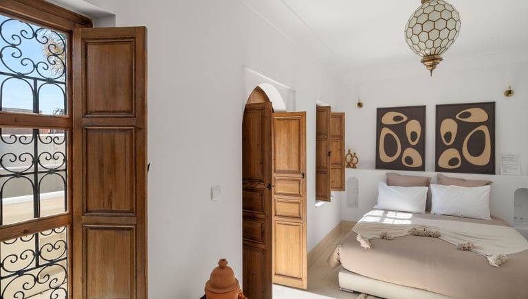 La terrasse et le rooftop dévoilent une vue imprenable sur toute la médina , l'Atlas et les toits de Marrakech, un cadre idéal pour savourer un thé à la menthe ou admirer le coucher de soleil sur la ville rouge.