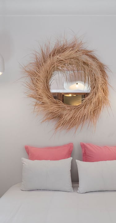 Le décor mêle artisanat marocain et inspirations bohèmes : suspensions en fibres naturelles, miroir tressé, tissus aux textures douces… Chaque détail a été pensé pour offrir un cocon chaleureux et raffiné.