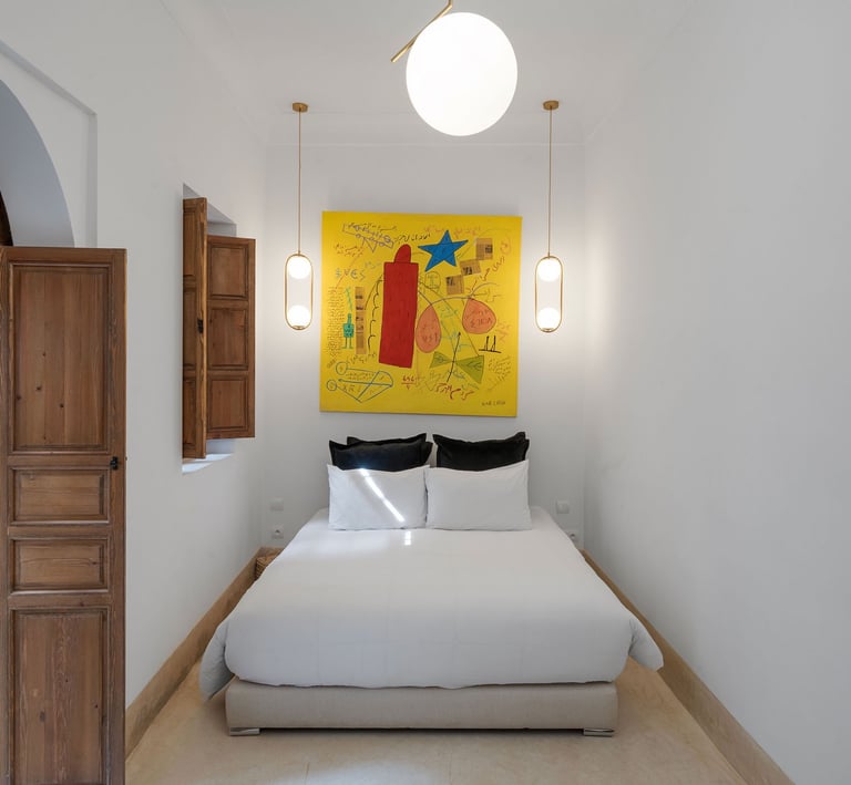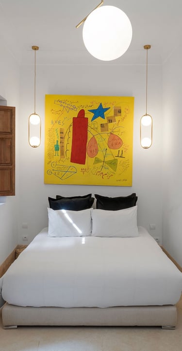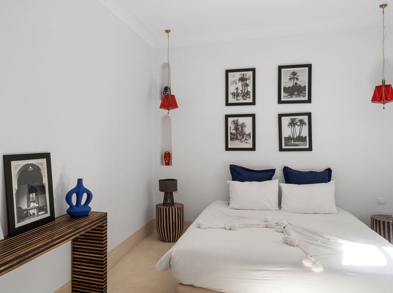 Alliant confort contemporain et esprit marocain, cette chambre offre un cadre chaleureux et raffiné, idéal pour se détendre après une journée dans la médina.