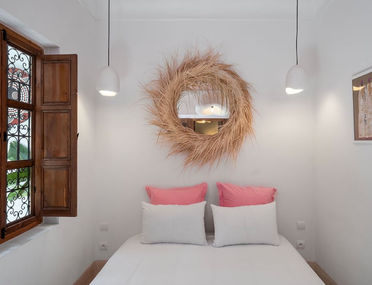 Délicate et lumineuse, la chambre Rose évoque la douceur d’un matin d’été à Marrakech. Son plafond rose et ses teintes naturelles créent une atmosphère apaisante, à la fois féminine et solaire.