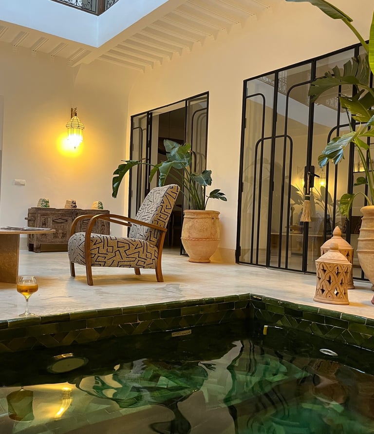 Au cœur du Riad, la piscine se dévoile comme un petit joyau discret, entièrement habillée de zelliges verts façonnés à la main.